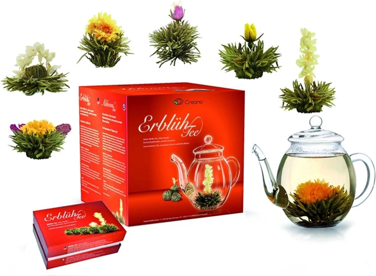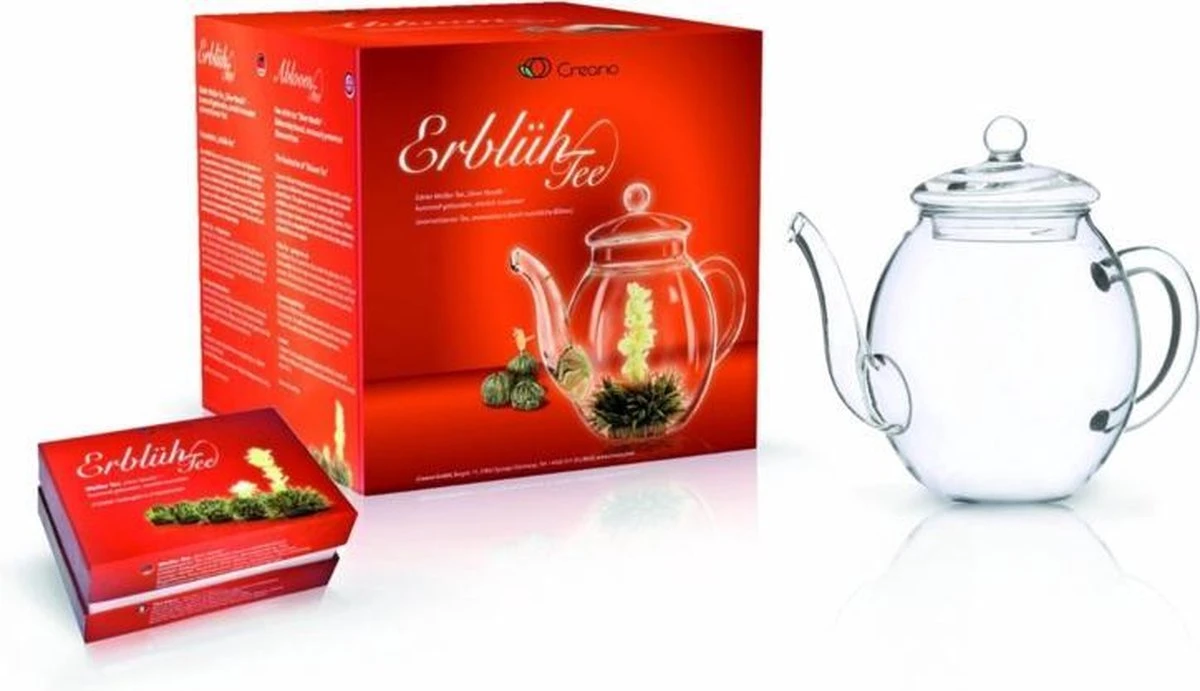 – 6 aromatische variaties van witte thee – Inclusief een hittebestendige glazen kan 0,5 l – In aantrekkelijke geschenkverpakkingen voor echte theeliefhebbers – Elke theebloem kan tot 3 keer worden toegediend voor ongeveer 1,5 liter thee Bijna alles is handgemaakt op deze thee! De bloeiende thee biedt de connaisseur een buitengewone ervaring: in de bal zit een artistiek geĆÆntegreerde, exotische bloesem. De bal zal zijn geheim echter niet onthullen totdat hij in een pot met kokend water is geplaatst. Het begint langzaam te openen en aan het einde van de infusieproductie produceert het de ingebedde bloem, die oprijst in een vorm die rijk en kleurrijk is. Slechts enkele meester bindmiddel in de zogenaamde, is voorbehouden aan de gedroogde bladeren van witte thee binden in een bolvorm, omdat de kennis van deze zeldzame kunst streng wordt bewaakt. Zo blijft de bloeiende thee een waardevolle zeldzaamheid van China. De Creano-glazen theepot is speciaal ontwikkeld voor de traditionele en conventionele theevoorbereiding.