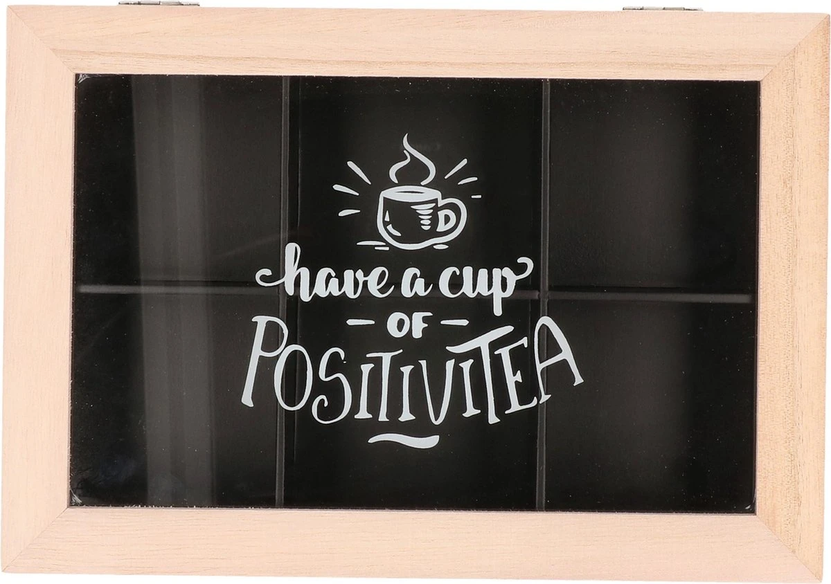 Houten theedoos/theekist zwart/bruin met 6 vakken 24 x 16 x 7 cm. Vierkante 6-vaks theedoos voor het bewaren van diverse soorten thee/theezakjes. Met doorzichtig deksel met de tekst ‘Have a Cup of Positivea’ op het glazen deksel.