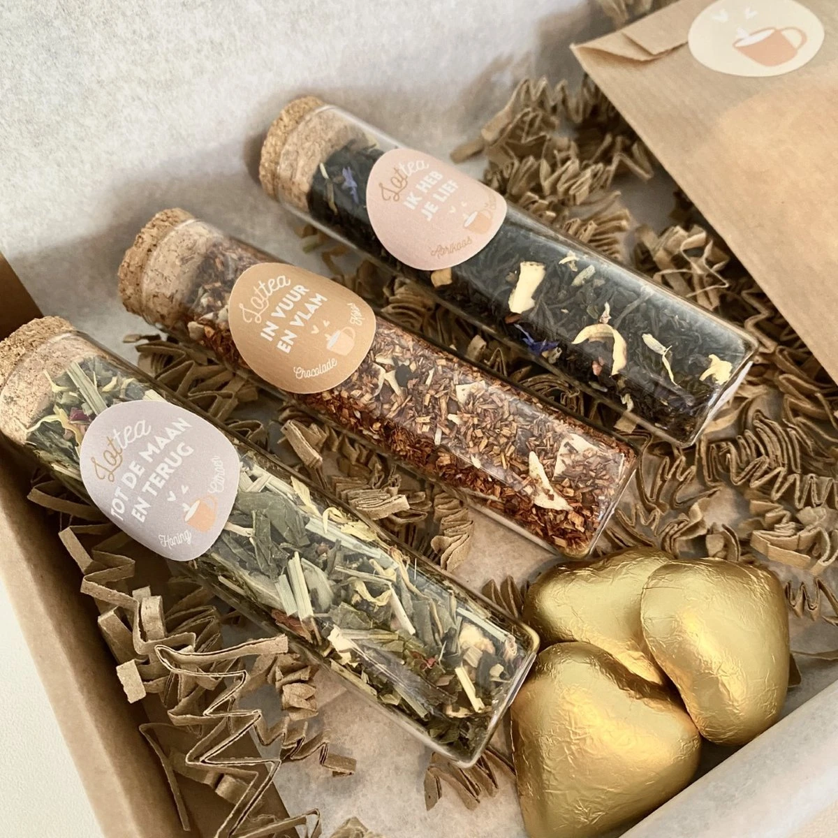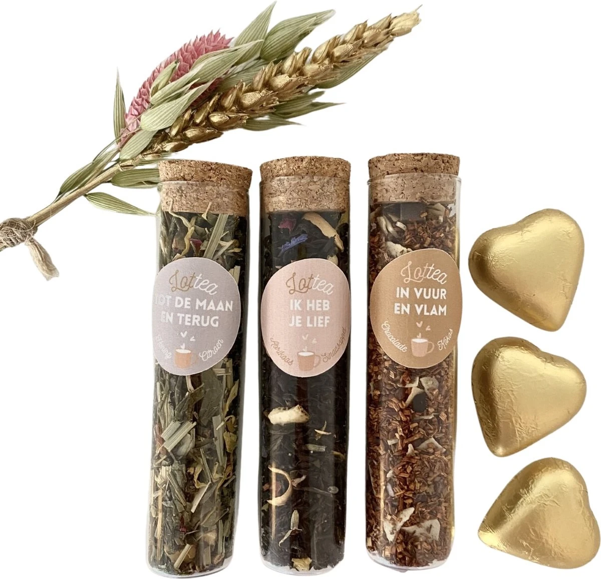 Deze romantische Giftset is een ideaal thee cadeautje voor jouw lieve vriendin, moeder of tante! Wie verras jij dit jaar met Valentijn? De Giftset Theeproeverij ‘Hartjesogen’ bevat 3 verschillende soorten thee in mooie buisjes. Niet zomaar theeën, maar theeën met een verhaal, een boodschap. Zoals de Ik Heb je Lief thee; een liefdevolle, zoetsappige Zwarte thee met goudsbloem, sinaasappelbloesem en lavendel, en de In Vuur en Vlam thee; een krachtige, aanbiddelijke Rooibos thee met cacao nibs en kokos.