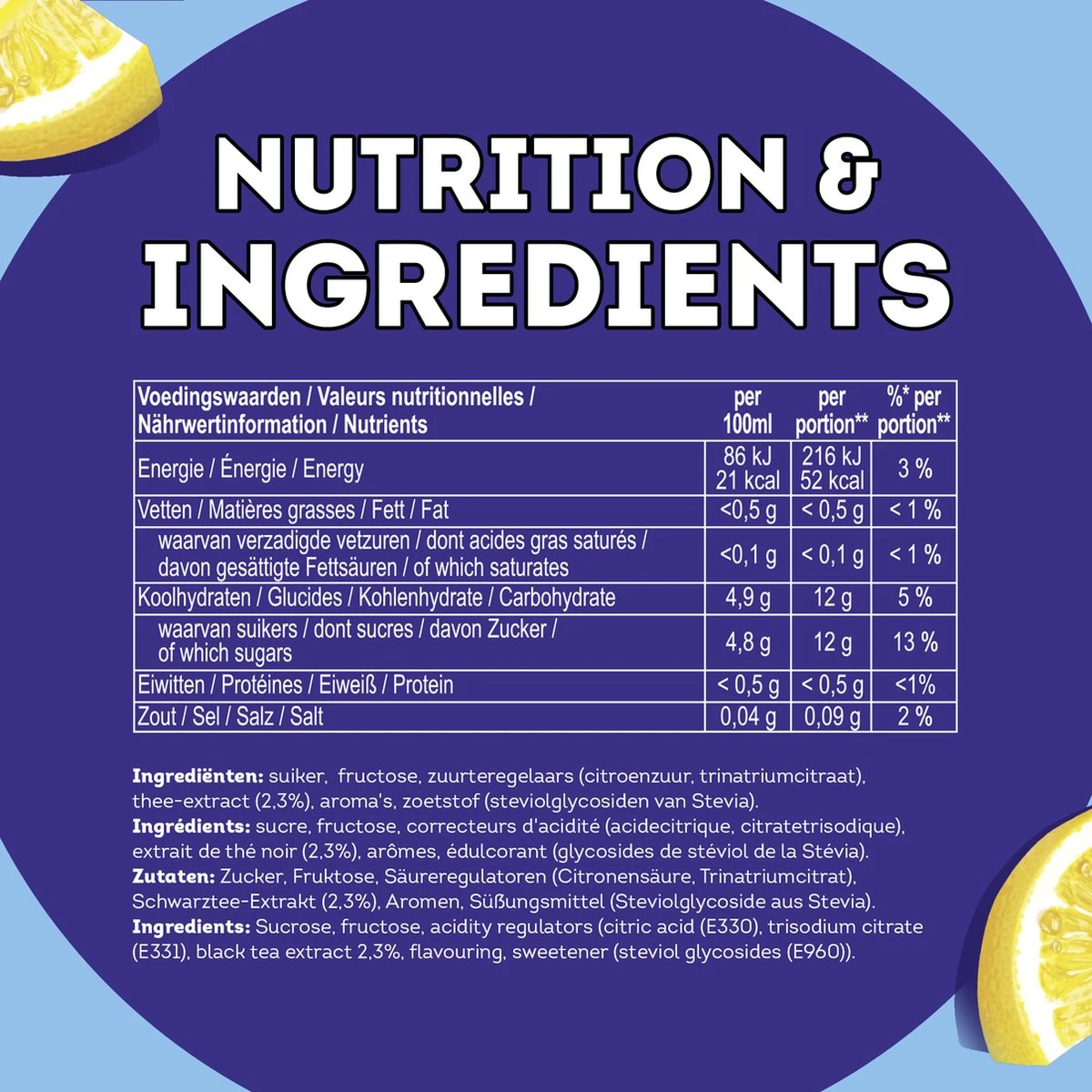 Deze verpakking bevat 18 zakjes van 52 gram – per zakje maakt u eenvoudig één liter ijsthee