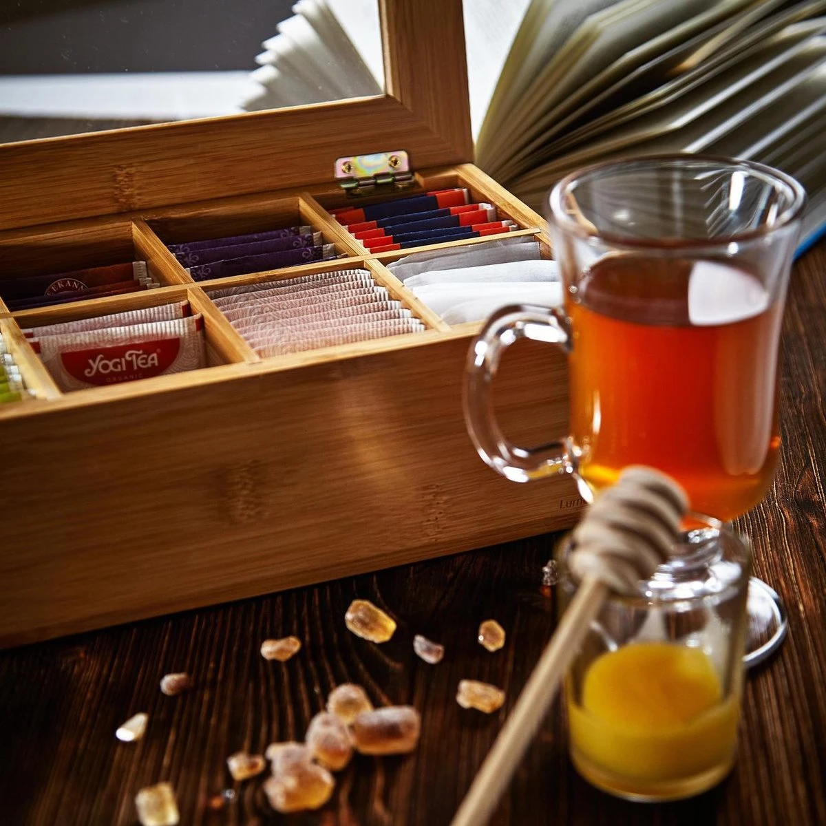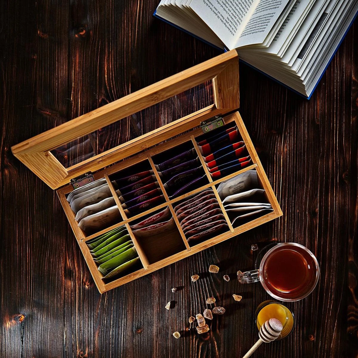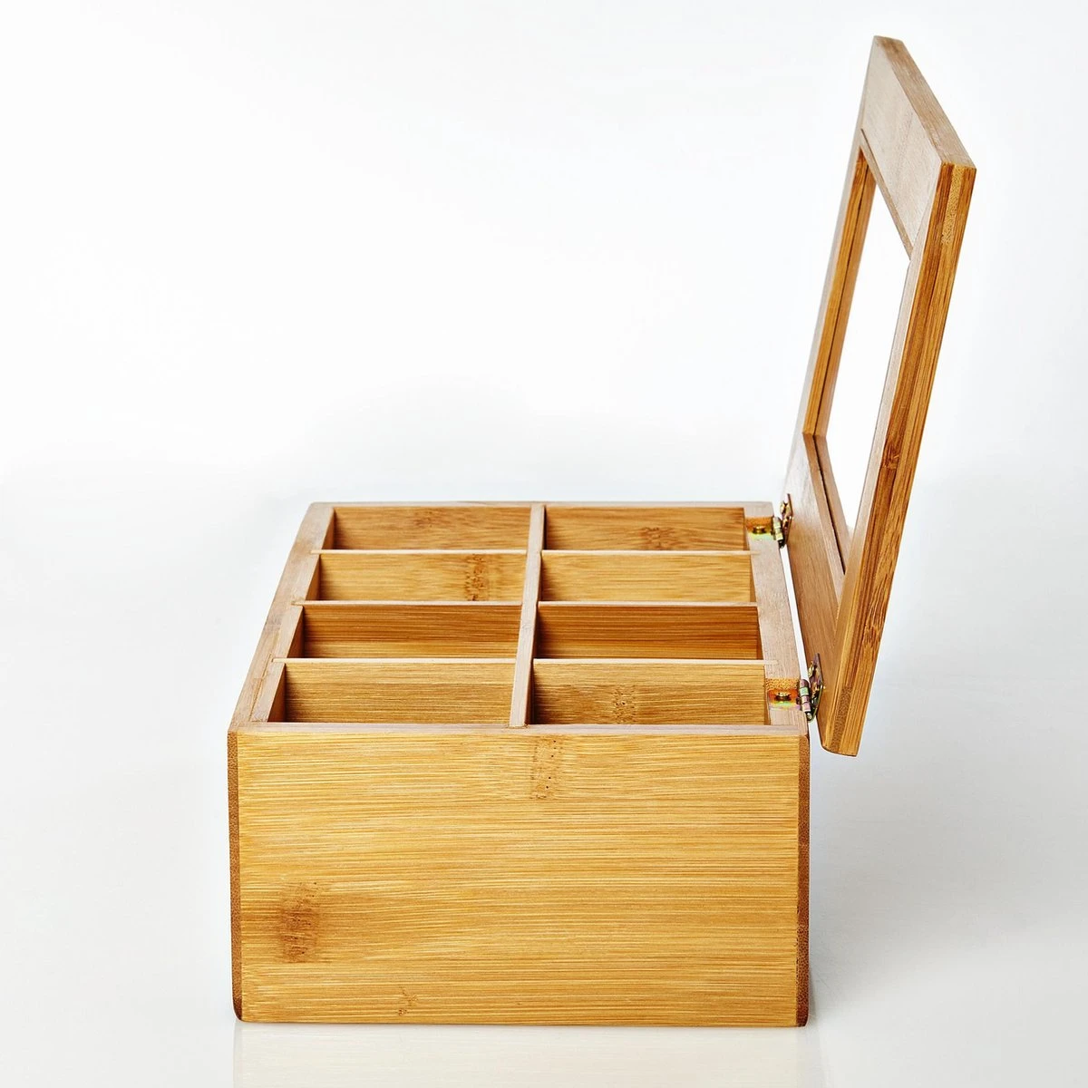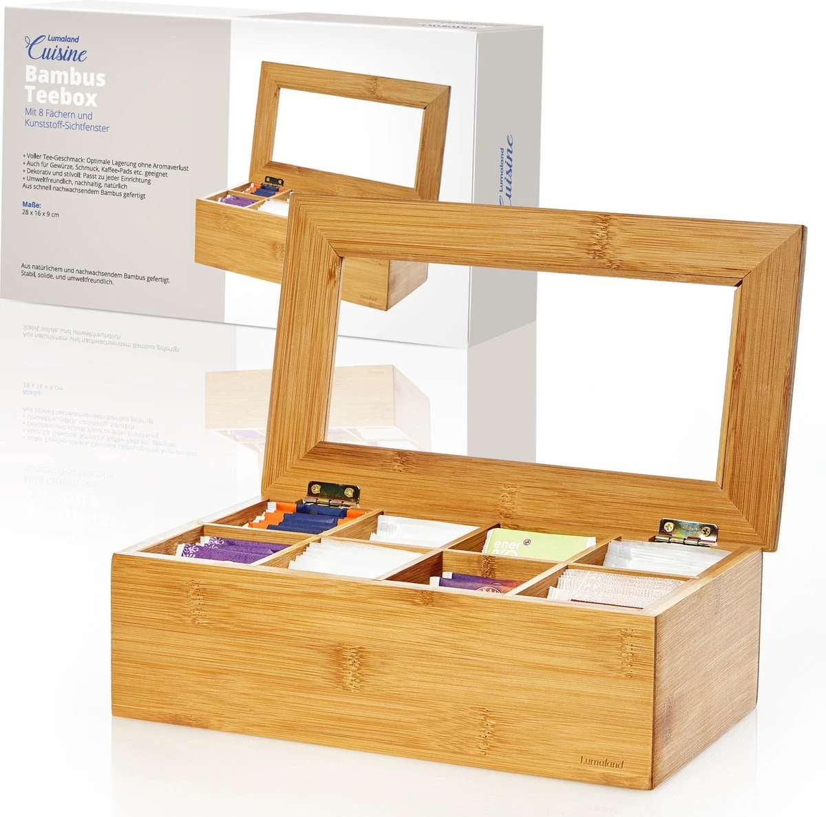De stijlvolle en decoratieve bamboe theedoos uit de Lumaland Cuisine is uitgerust met 8 vakken en geschikt voor alle gangbare theezakjes. Door het transparante venster is direct zichtbaar hoe vol de theebox is en of deze eventueel bijgevuld moet worden.