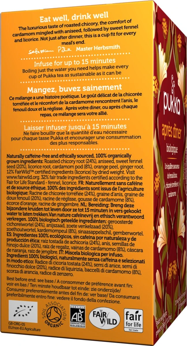 Ideaal om na het eten van te genieten. Een heerlijke blend met venkelzaad, cichorei en kardemompeulen. Deze blend bevat zoethout. Zoethout wordt traditioneel geconsumeerd om bij te dragen aan de spijsvertering.* Wij streven ernaar positieve verandering te brengen op de wereld – voor jou, de natuur en alles daar tussenin. Pukka After Dinner is een blend met cichorei, anijszaad, venkel, zoethout, kardemom, venkel en gember. Gemaakt van 100% biologische ingrediĆ«nten die duurzaam verbouwd zijn. Bovendien zijn we trots om aangesloten te zijn bij 1% for the Planet en is dit product Fair for Life en FairWild gecertificeerd. Breng deze heerlijke kruiden tot leven door ze tot 15 minuten in vers gekookt water te laten trekken. Een doosje bevat 20 individueel verpakte theezakjes die volledig biologisch afbreekbaar zijn. *Geniet van deze infusies als onderdeel van een gezonde voeding en levensstijl. In afwachting van toelating door de Europese Commissie