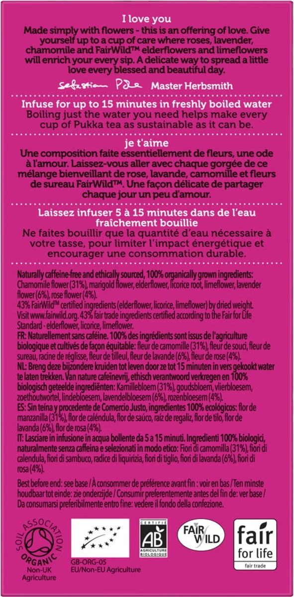 | Ingrediƫnten | Kamillebloem (25%), lindebloesem, vlierbloesem, goudsbloem, zoethoutwortel, rozenbloem (5%), lavendelbloem (5%) 100% gecertificeerd biologisch. GB-ORG-05 Kan sporen bevatten van haver (gluten), melk, amandelen, selderij en mosterd |