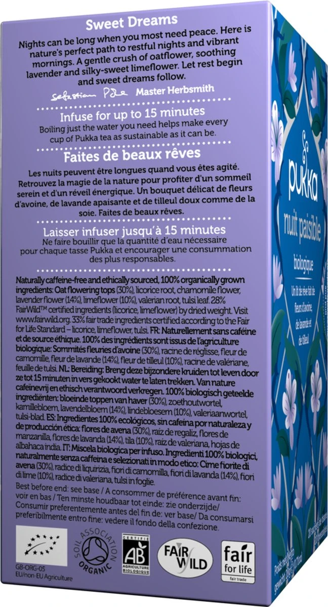Kom tot rust met een kopje Pukka Night Time. Deze blend bevat kamille en lavendel. Deze kruiden worden traditioneel geconsumeerd om bij te dragen aan een optimale ontspanning en om te helpen bij het behouden van een goede nachtrust.* Wij streven ernaar positieve verandering te brengen op de wereld – voor jou, de natuur en alles daar tussenin. Pukka Night Time is een blend met haverbloem, verzachtende lavendel en zijdezachte limoenbloem. Gemaakt van 100% biologische ingrediënten die duurzaam verbouwd zijn. Bovendien zijn we trots om aangesloten te zijn bij 1% for the Planet en is dit product Fair for Life en FairWild gecertificeerd. Breng deze heerlijke kruiden tot leven door ze tot 15 minuten in vers gekookt water te laten trekken. Een doosje bevat 20 individueel verpakte theezakjes die volledig biologisch afbreekbaar zijn.
