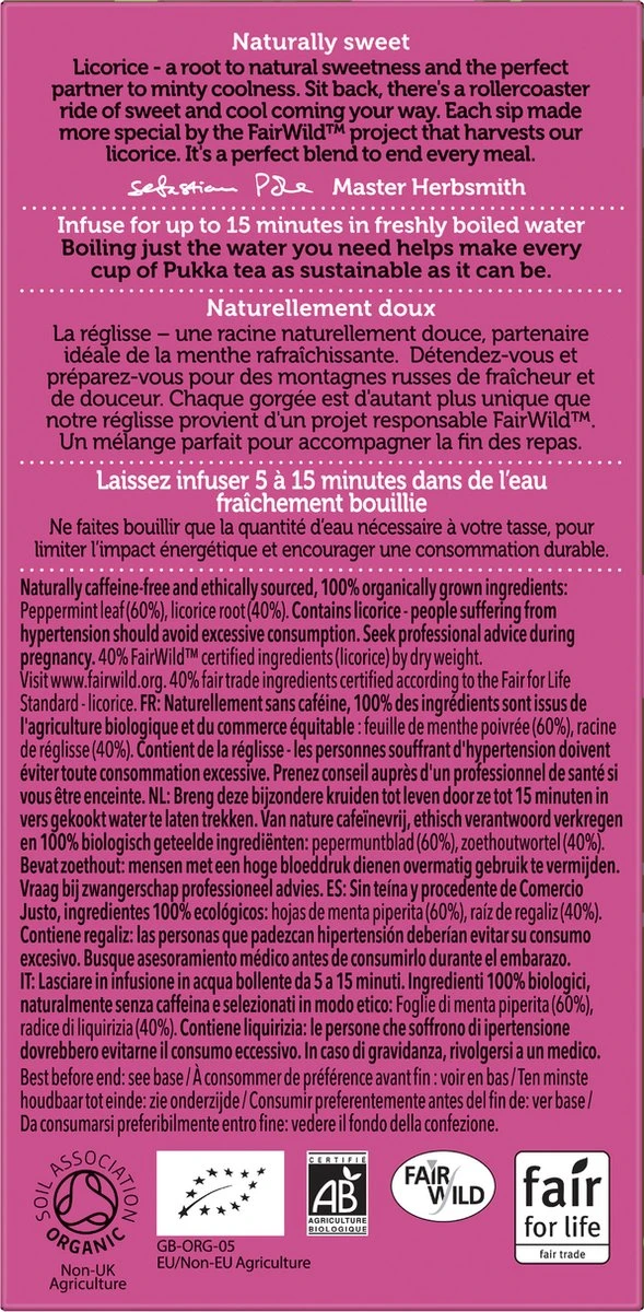 Pukka Thee Peppermint Licorice is een biologisch pepermunt- en zoethout thee met een heerlijk verfrissende smaak. Eén verpakking bevat 20 theezakjes.
